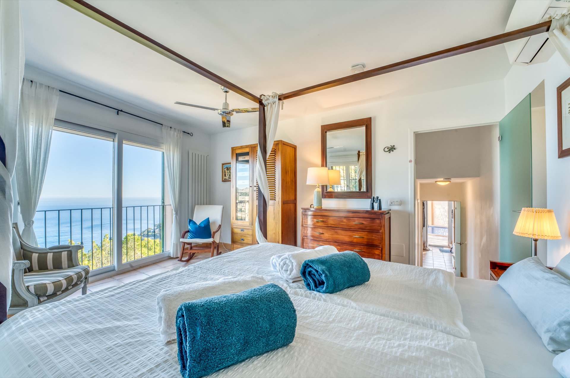 Luxuriöses Himmelbett, Ensuite-Bad mit Regendusche und freistehender Badewanne, direkter Meerblick